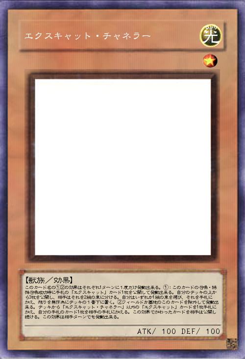 | このカード名の①②の効果はそれぞれ1ターンに1度だけ発動出来る。①:このカードの召喚・特殊召喚成功時に手札の「エクスキャット」カード1枚を公開して発動出来る。自分のデッキの上から3枚を公開し、相手はそれを2組の束に分ける。自分はいずれか1組の束を選び、それを手札に加え、残りを無作為にデッキの1番下に置く。②フィールドか墓地のこのカードを除外して発動出来る。デッキから「エクスキャット・チャネラー」以外の「エクスキャット」カードを1枚手札に加え、自分の手札のカード1枚を相手の手札に加える。この効果で加わったカードを相手は公開し続ける。この効果は相手ターンでも発動出来る。 | |||