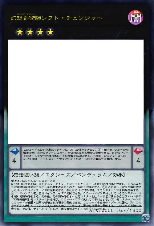 | このカード名のP効果は1ターンに1度しか使用できない。①:相手モンスターの攻撃宣言時、自分のPゾーンにカードが2枚存在する場合に発動できる。自分のPゾーンのカードを全て特殊召喚し、その攻撃を無効にする。その後、自分フィールドの「幻想奇術師」Pモンスター1体を選んでこのカードの下に重ねてX素材とする。 | |||