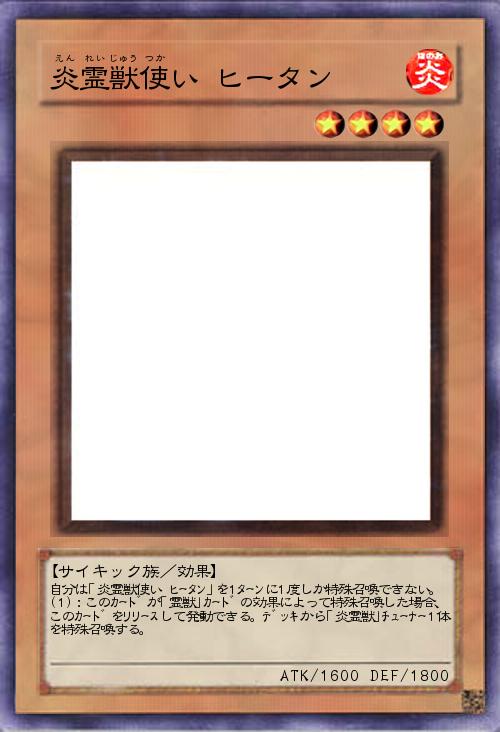 | 自分は「炎霊獣使い ヒータン」を1ターンに1度しか特殊召喚できない。 (1):このカードが「霊獣」カードの効果によって特殊召喚した場合、このカードをリリースして発動できる。デッキから「炎霊獣」チューナー1体を特殊召喚する。 | |||