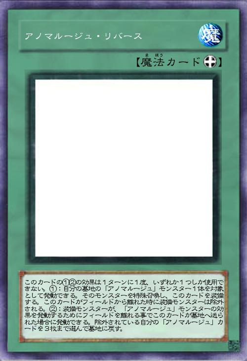 | このカードの①②の効果は1ターンに1度、いずれか1つしか使用できない。①:自分の墓地の「アノマルージュ」モンスター1体を対象として発動できる。そのモンスターを特殊召喚し、このカードを装備する。このカードがフィールドから離れた時に装備モンスターは除外される。②:装備モンスターが、「アノマルージュ」モンスターの効果を発動するためにフィールドを離れる事でこのカードが墓地へ送られた場合に発動できる。除外されている自分の「アノマルージュ」カードを3枚まで選んで墓地に戻す。 | |||