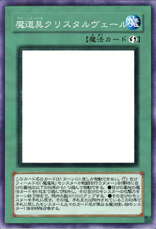 | このカード名のカードは1ターンに1度しか発動できない。①:自分フィールドの「魔道具」モンスターが戦闘を行うダメージ計算時に自分の墓地の以下の効果から1つ選んで発動できる。●自分の墓地の魔法カードを5枚まで選んで除外し、その自分のモンスターの攻撃力をターン終了時まで、除外た数×1000アップする。●その自分のモンスターを手札に戻す。その後、手札または除外されているこの効果で手札に戻したモンスターと元々のカード名が異なる魔法使い族モンスター1体を特殊召喚する。 | |||