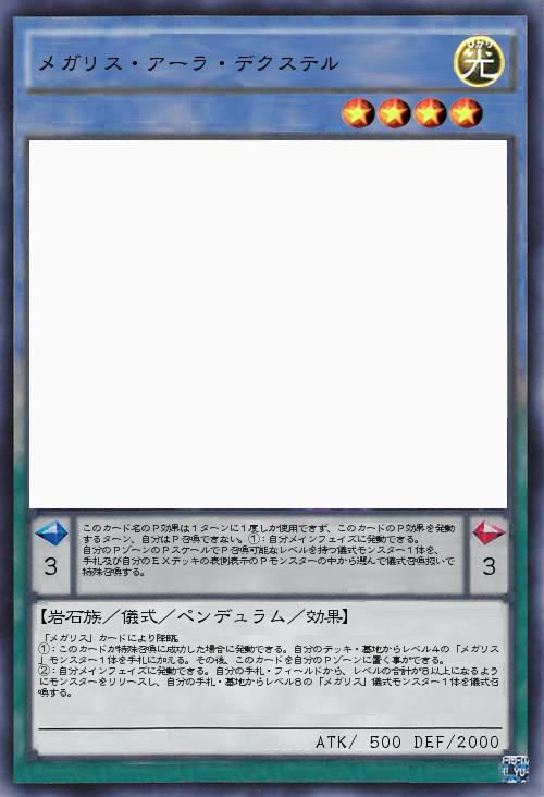 | 「メガリス」カードにより降臨。 ①:このカードが特殊召喚に成功した場合に発動できる。自分のデッキ・墓地からレベル4の「メガリス」モンスター1体を手札に加える。その後、このカードを自分のPゾーンに置く事ができる。 ②:自分メインフェイズに発動できる。自分の手札・フィールドから、レベルの合計が8以上になるようにモンスターをリリースし、自分の手札・墓地からレベル8の「メガリス」儀式モンスター1体を儀式召喚する。 | |||
