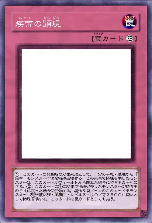 | ①:このカードの発動時の効果処理として、自分の手札・墓地から「疾帝」モンスター1体を特殊召喚する。この効果で特殊召喚したモンスターは、このカードがフィールドから離れた場合に持ち主の手札に戻る。②:このカードの①の効果で特殊召喚したモンスターが持ち主の手札に戻った場合に発動する。魔法&罠ゾーンのこのカードをモンスター(魔法使い族・風属性・レベル6・攻0/守2500)扱いとして特殊召喚する。このカードは罠カードとしても扱う。 | |||
