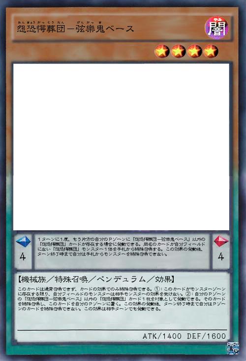 | 1ターンに1度、もう片方の自分のPゾーンに「怨恐愕葬団-弦樂鬼ベース」以外の「怨恐愕葬団」カードが存在する場合に発動できる。同名のカードが自分フィールドにない「怨恐愕葬団」モンスター1体を手札から特殊召喚する。この効果の発動後、ターン終了時まで自分は手札からモンスターを特殊召喚できない。 | |||