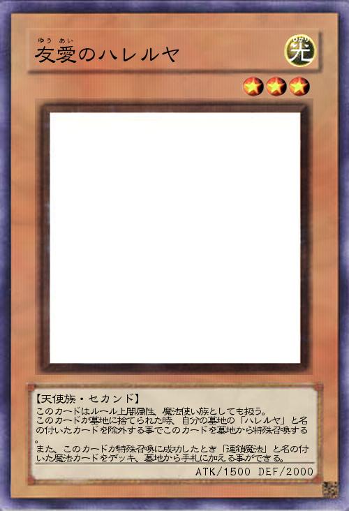 このカードはルール上闇属性、魔法使い族としても扱う。 このカードが墓地に捨てられた時、自分の墓地の「ハレルヤ」と名の付いたカードを除外する事でこのカードを墓地から特殊召喚する。 また、このカードが特殊召喚に成功したとき「連鎖魔法」と名の付いた魔法カードをデッキ、墓地から手札に加える事ができる。 |