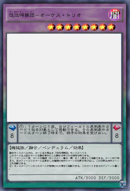 | 融合モンスター以外の、カード名が異なる「怨恐愕葬団」モンスター×3 このカードは上記のカードを融合素材にした融合召喚でのみ特殊召喚できる。 ①:1ターンに1度、カードの種類(モンスター・魔法・罠)を1つ宣言して発動できる。ターン終了時まで、自分フィールドのカードは宣言した種類の相手のカードの効果を受けない。この効果は相手ターンでも発動できる。 ②:モンスターゾーンのこのカードが破壊された場合に発動できる。このカードを自分のPゾーンに置く。 | |||