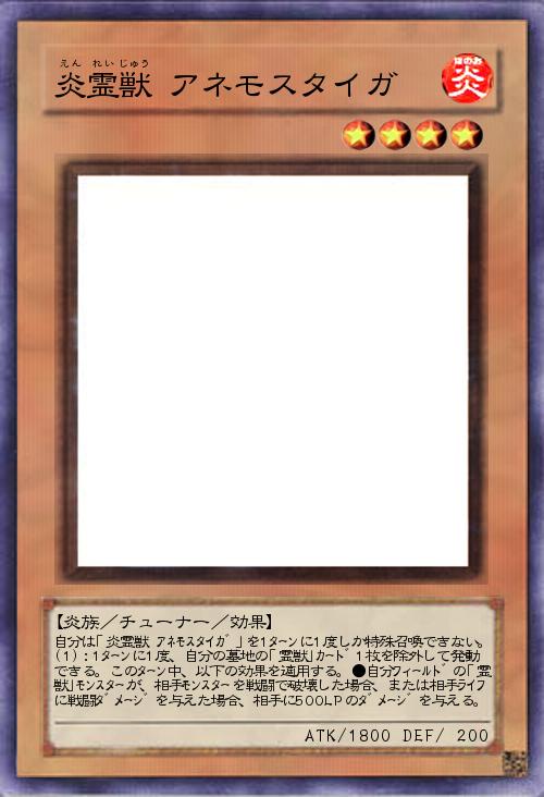 | 自分は「炎霊獣 アネモスタイガ」を1ターンに1度しか特殊召喚できない。(1):1ターンに1度、自分の墓地の「霊獣」カード1枚を除外して発動できる。このターン中、以下の効果を適用する。●自分フィールドの「霊獣」モンスターが、相手モンスターを戦闘で破壊した場合、または相手ライフに戦闘ダメージを与えた場合、相手に500LPのダメージを与える。 | |||