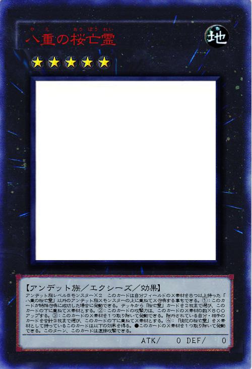 | アンデット族レベル5モンスター×2 このカードは自分フィールドのX素材を8つ以上持った「八重の桜亡霊」以外のアンデット族Xモンスターの上に重ねてX召喚する事もできる。①:このカードが特殊召喚に成功した場合に発動できる。デッキから「桜亡霊」カードを2枚まで選び、このカードの下に重ねてX素材とする。②:このカードの攻撃力は、このカードのX素材の数×800アップする。③:このカードのX素材を1つ取り除いて発動できる。除外されている自分・相手のカードを合計3枚まで選び、このカードの下に重ねてX素材とする。④:「徒花の桜亡霊」をX素材として持っているこのカードは以下の効果を得る。●このカードのX素材を1つ取り除いて発動できる。このターン、このカードは直接攻撃できる。 | |||