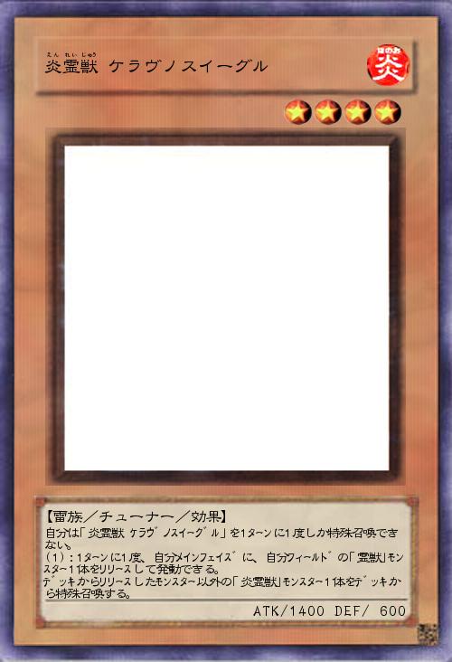 | 自分は「炎霊獣 ケラヴノスイーグル」を1ターンに1度しか特殊召喚できない。 (1):1ターンに1度、自分メインフェイズに、自分フィールドの「霊獣」モンスター1体をリリースして発動できる。 デッキからリリースしたモンスター以外の「炎霊獣」モンスター1体をデッキから特殊召喚する。 | |||