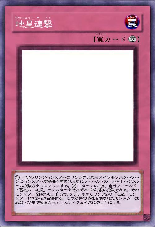 | ①:自分のリンクモンスターのリンク先となるメインモンスターゾーンにモンスターが特殊召喚される度にフィールドの「地星」モンスターの攻撃力を300アップする。②:1ターンに1度、自分フィールド・墓地の「地星」モンスターをそれぞれ1体対象に発動できる。そのモンスターを除外し、自分のEXデッキからリンク2の「地星」モンスター1体を特殊召喚する。この効果で特殊召喚されたモンスターは戦闘・効果で破壊されず、エンドフェイズにデッキに戻る。 | |||