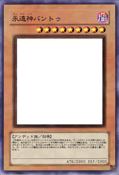 | 「永遠神バントゥ」は自分フィールド上に1体だけ存在出来る。①:このカードの召喚に成功した場合に、他の自分フィールド上のカードを任意の枚数リリースして発動出来る。リリースした枚数分のカードをドローし、自分はこの効果でドローしたカードの枚数×600ポイントのライフを失う。②:このカードが墓地に送られるか除外される場合、代わりにデッキの上から2番目に置いても良い。 | |||