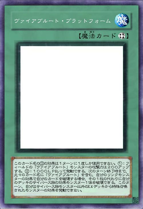 | このカード名の②の効果は1ターンに1度しか使用できない。①:フィールドの「ヴァイアブルート」モンスターの攻撃力は200アップする。②:1000LP払って発動できる。次のターン終了時まで、元々のカード名に「ヴァイアブルート」を含む、自分のリンクモンスターの効果で自分のカードを破壊する場合、その1枚の代わりに自分のデッキのサイバース族の効果モンスター1体を破壊できる。このターン、自分はサイバース族モンスター以外のEXデッキから特殊召喚されたモンスターの効果を発動できない。 | |||