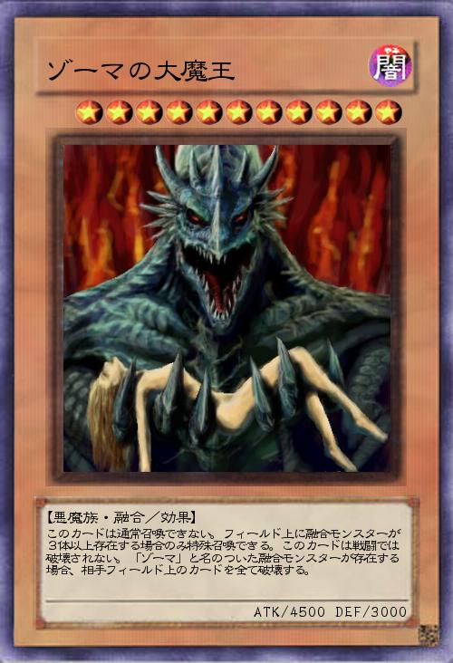 | このカードは通常召喚できない。フィールド上に融合モンスターが3体以上存在する場合のみ特殊召喚できる。このカードは戦闘では破壊されない。「ゾーマ」と名のついた融合モンスターが存在する場合、相手フィールド上のカードを全て破壊する。 | |||