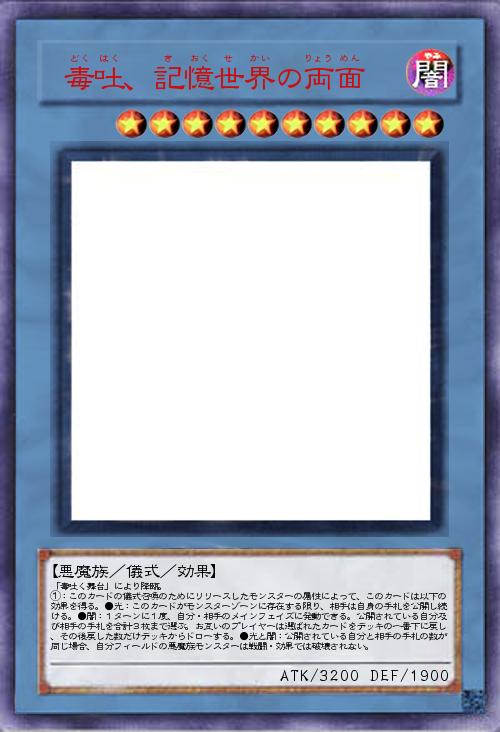 | 「毒吐く舞台」により降臨。 ①:このカードの儀式召喚のためにリリースしたモンスターの属性によって、このカードは以下の効果を得る。●光:このカードがモンスターゾーンに存在する限り、相手は自身の手札を公開し続ける。●闇:1ターンに1度、自分・相手のメインフェイズに発動できる。公開されている自分及び相手の手札を合計3枚まで選ぶ。お互いのプレイヤーは選ばれたカードをデッキの一番下に戻し、その後戻した数だけデッキからドローする。●光と闇:公開されている自分と相手の手札の数が同じ場合、自分フィールドの悪魔族モンスターは戦闘・効果では破壊されない。 | |||