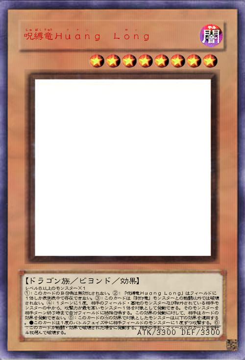 | レベル8以上のモンスター×1 ①:このカードのB召喚は無効化されない。②:「呪縛竜Huang Long」はフィールドに1体しか表側表示で存在できない。③:このカードは「封印竜」モンスターとの戦闘以外では破壊されない。④:1ターンに1度、相手のフィールド・墓地のモンスター及び除外されている相手モンスターの中から、攻撃力が最も高いモンスター1体を対象として発動できる。そのモンスターを相手ターン終了時まで自分フィールドに特殊召喚する。この効果の発動に対して、相手はカードの効果を発動できない。⑤:このカードの④の効果で対象としたモンスターは以下の効果を適用する。●このカードは1度のバトルフェイズ中に相手フィールドのモンスターに1度ずつ攻撃する。⑥:このカードが戦闘・効果で破壊された場合に発動する。相手の手札・フィールドのカードを合計4枚選んで破壊する。 | |||