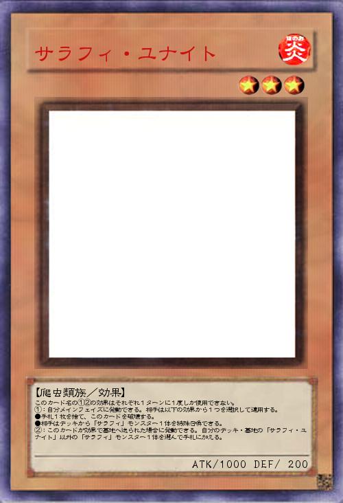 | このカード名の①②の効果はそれぞれ1ターンに1度しか使用できない。 ①:自分メインフェイズに発動できる。相手は以下の効果から1つを選択して適用する。 ●手札1枚を捨て、このカードを破壊する。 ●相手はデッキから「サラフィ」モンスター1体を特殊召喚できる。 ②:このカードが効果で墓地へ送られた場合に発動できる。自分のデッキ・墓地の「サラフィ・ユナイト」以外の「サラフィ」モンスター1体を選んで手札に加える。 | |||
