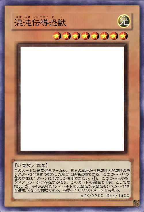 「カオス化したスーパーコンダクターティラノ。闇属性扱いになり、手札かフィールドの光属性か闇属性モンスターをコストにして1000バーンダメージを与えます。」(2020-09-14 00:06)