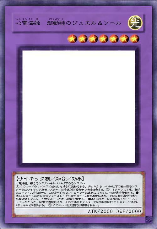 | 「電海姫」融合モンスター+レベル4以下のモンスター ①:このカードのリバースに成功した場合に発動できる。デッキからレベル4以下の戦士族モンスター又はサイキック族モンスター1体を裏側守備表示で特殊召喚する。②:1ターンに1度、相手はコイントスを1回行う。このカードのコントローラーは裏表によって以下の効果を発動する。●表:このカード以外の自分フィールド・手札からカード2枚を墓地に送り、その2枚で融合召喚可能な融合モンスター1体をEXデッキから融合召喚する。 ●裏:このカード以外の自分フィールド・デッキからカード2枚を墓地に送り、その2体のモンスターでS召喚可能なSモンスター1体をEXデッキからS召喚する。 ③:このカードは戦闘では破壊されない。 | |||