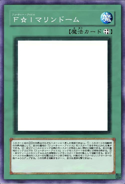 | このカード名の②③の効果はそれぞれ1ターンに1度しか使用できない。①:このカードの発動時の効果処理として、自分の墓地の「フューチャー・アイドル」モンスター1体を手札に加える事ができる。②:自分フィールドにリンク状態のモンスターが存在しない場合に発動できる。自分の墓地のリンク2以下の「フューチャー・アイドル」リンクモンスター1体を選んで特殊召喚する。③:自分フィールドのリンク4以上の海竜族リンクモンスター1体を対象として発動できる。自分フィールドの水属性モンスターの攻撃力はターン終了時まで、対象のモンスターのリンクマーカーの数×400アップする。この効果を発動するターン、自分は直接攻撃できない。 | |||