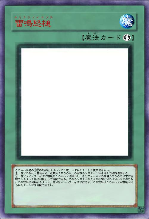 | このカード名の①②の効果は1ターンに1度、いずれか1つしか使用できない。 ①:自分の手札・墓地から、攻撃力2500以上の雷族モンスター1体を選んで特殊召喚する。 ②:自分メインフェイズに墓地のこのカードを除外し、自分フィールドの守備力2000以下の雷族モンスター1体を対象として発動できる。そのモンスターの元々の攻撃力分のダメージを与える。この効果を発動するターン、自分はバトルフェイズを行えず、この効果はこのカードが墓地へ送られたターンには発動できない。 | |||
