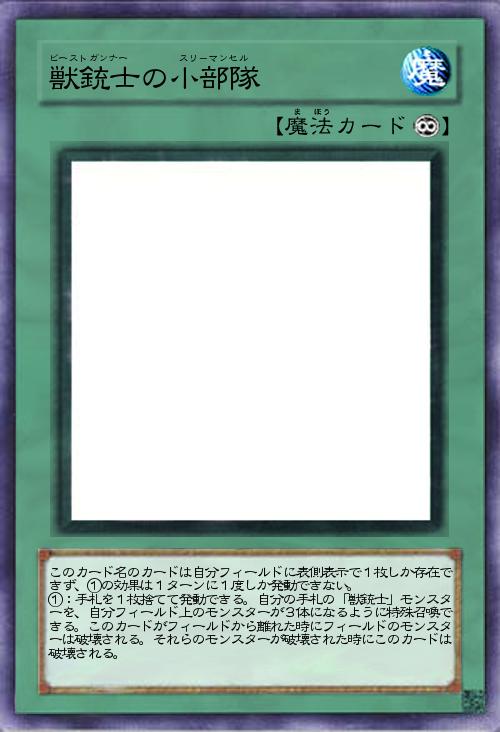 | このカード名のカードは自分フィールドに表側表示で1枚しか存在できず、①の効果は1ターンに1度しか発動できない。 ①:手札を1枚捨てて発動できる。自分の手札の「獣銃士」モンスターを、自分フィールド上のモンスターが3体になるように特殊召喚できる。このカードがフィールドから離れた時にフィールドのモンスターは破壊される。それらのモンスターが破壊された時にこのカードは破壊される。 | |||