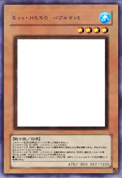 | このカード名②の効果は1ターンに1度しか使用できない。 ①このカードは「E・HERO バブルマン」としても扱う。 ②このカードが「HERO」融合モンスターの融合素材に使用された場合発動できる。手札が2枚になるようカードをドローする。 ③このカードが「E・HERO バブルマン」を融合素材に指定する「HERO」融合モンスターの素材になった時、そのモンスターに以下の効果を与える。 ●このカードが戦闘を行ったダメージステップ終了時、相手フィールド上のカード1枚を選択して破壊できる。 | |||
