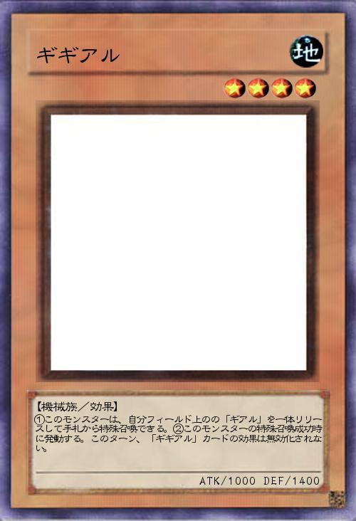 | ①このモンスターは、自分フィールド上のの「ギアル」を一体リリースして手札から特殊召喚できる。②このモンスターの特殊召喚成功時に発動する。このターン、「ギギアル」カードの効果は無効化されない。 | |||