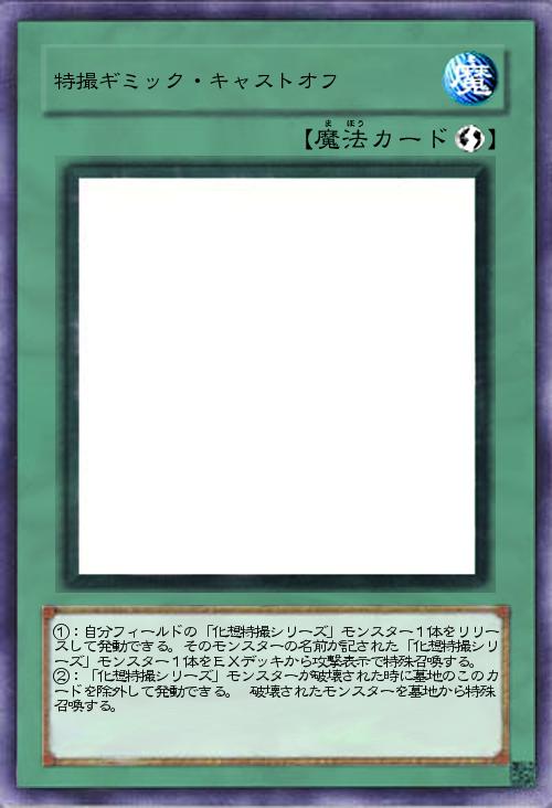 | ①:自分フィールドの「化想特撮シリーズ」モンスター1体をリリースして発動できる。そのモンスターの名前が記された「化想特撮シリーズ」モンスター1体をEXデッキから攻撃表示で特殊召喚する。 ②:「化想特撮シリーズ」モンスターが破壊された時に墓地のこのカードを除外して発動できる。 破壊されたモンスターを墓地から特殊召喚する。 | |||