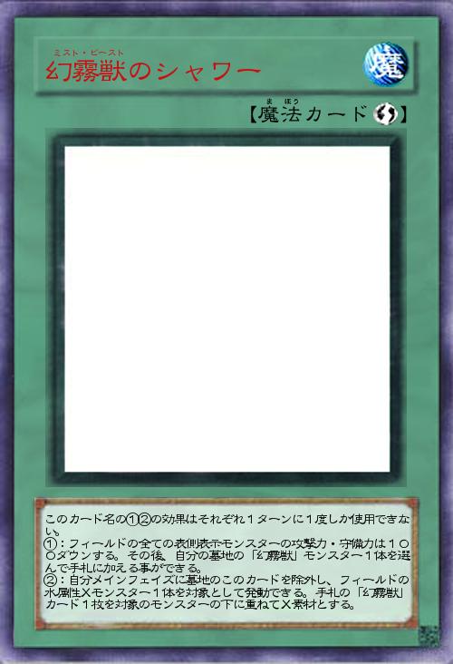 | このカード名の①②の効果はそれぞれ1ターンに1度しか使用できない。 ①:フィールドの全ての表側表示モンスターの攻撃力・守備力は100ダウンする。その後、自分の墓地の「幻霧獣」モンスター1体を選んで手札に加える事ができる。 ②:自分メインフェイズに墓地のこのカードを除外し、フィールドの水属性Xモンスター1体を対象として発動できる。手札の「幻霧獣」カード1枚を対象のモンスターの下に重ねてX素材とする。 | |||