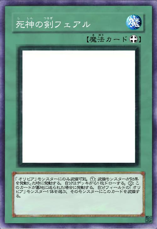 | 「オリビア」モンスターにのみ装備可能。①:装備モンスターが効果を発動した時に発動する。自分はデッキから1枚ドローする。②:このカードが墓地に送られた場合に発動する。自分フィールドの「オリビア」モンスター1体を選ぶ、そのモンスターにこのカードを装備する。 | |||