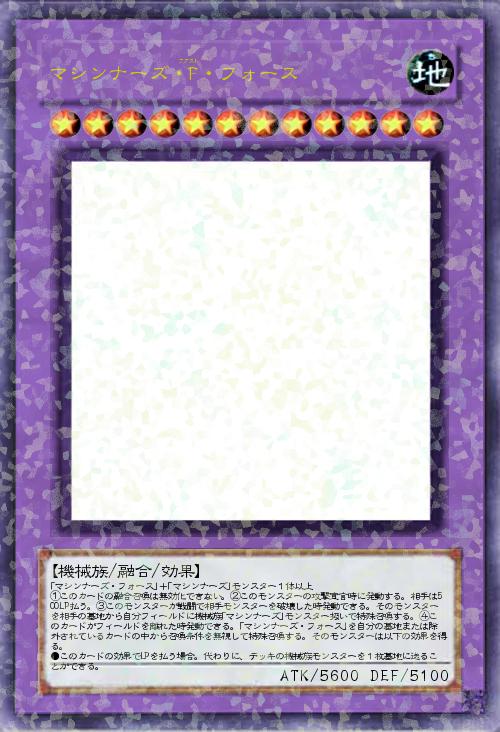 | 「マシンナーズ・フォース」+「マシンナーズ」モンスター1体以上 ①このカードの融合召喚は無効化できない。②このモンスターの攻撃宣言時に発動する。相手は500LP払う。③このモンスターが戦闘で相手モンスターを破壊した時発動できる。そのモンスターを相手の墓地から自分フィールドに機械族「マシンナーズ」モンスター扱いで特殊召喚する。④このカードがフィールドを離れた時発動できる。「マシンナーズ・フォース」を自分の墓地または除外されているカードの中から召喚条件を無視して特殊召喚する。そのモンスターは以下の効果を得る。 ●このカードの効果でLPを払う場合。代わりに、デッキの機械族モンスターを1枚墓地に送ることができる。 | |||