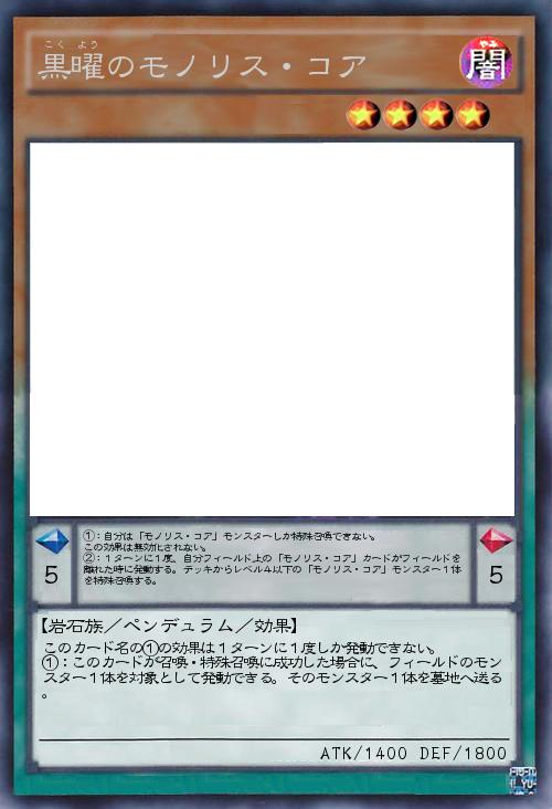 | ①:自分は「モノリス・コア」モンスターしか特殊召喚できない。 この効果は無効化されない。 ②:1ターンに1度、自分フィールド上の「モノリス・コア」カードがフィールドを離れた時に発動する。デッキからレベル4以下の「モノリス・コア」モンスター1体を特殊召喚する。 | |||