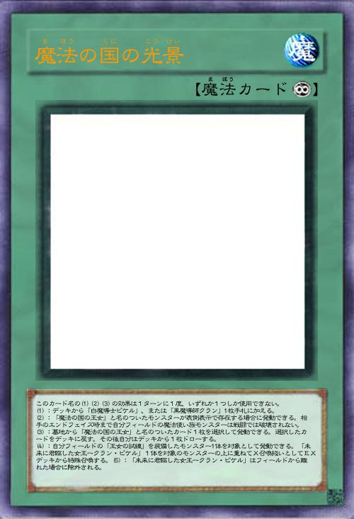 | このカード名の(1)(2)(3)の効果は1ターンに1度、いずれか1つしか使用できない。 (1):デッキから「白魔導士ピケル」、または「黒魔導師クラン」1枚手札に加える。 (2):「魔法の国の王女」と名のついたモンスターが表側表示で存在する場合に発動できる。相手のエンドフェイズ時まで自分フィールドの魔法使い族モンスターは戦闘では破壊されない。 (3):墓地から「魔法の国の王女」と名のついたカード1枚を選択して発動できる。選択したカードをデッキに戻す。その後自分はデッキから1枚ドローする。 (4):自分フィールドの「王女の試練」を装備したモンスター1体を対象として発動できる。「未来に君臨した女王ークラン・ピケル」1体を対象のモンスターの上に重ねてX召喚扱いとしてEXデッキから特殊召喚する。(5):「未来に君臨した女王ークラン・ピケル」はフィールドから離れた場合に除外される。 | |||