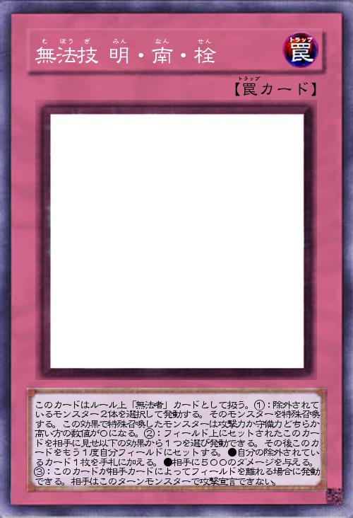 | このカードはルール上「無法者」カードとして扱う。①:除外されているモンスター2体を選択して発動する。そのモンスターを特殊召喚する。この効果で特殊召喚したモンスターは攻撃力か守備力どちらか高い方の数値が0になる。②:フィールド上にセットされたこのカードを相手に見せ以下の効果から1つを選び発動できる。その後このカードをもう1度自分フィールドにセットする。●自分の除外されているカード1枚を手札に加える。●相手に500のダメージを与える。③:このカードが相手カードによってフィールドを離れる場合に発動できる。相手はこのターンモンスターで攻撃宣言できない。 | |||