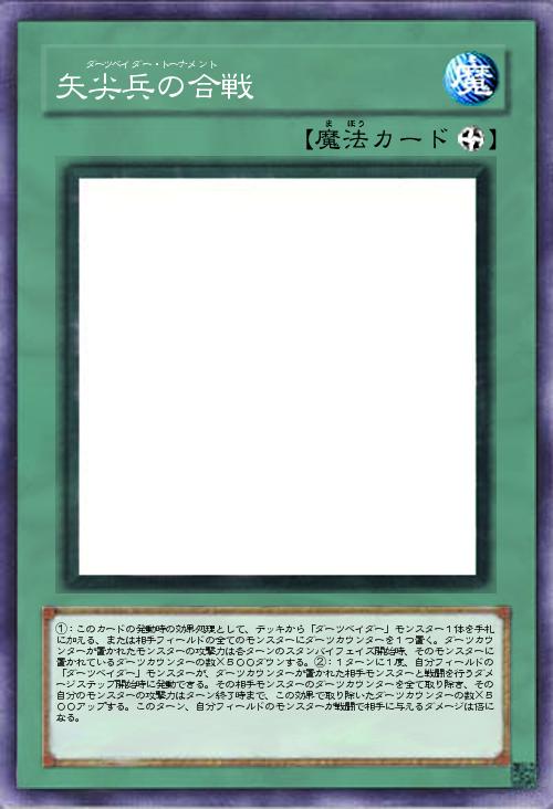 | ①:このカードの発動時の効果処理として、デッキから「ダーツベイダー」モンスター1体を手札に加える、または相手フィールドの全てのモンスターにダーツカウンターを1つ置く。ダーツカウンターが置かれたモンスターの攻撃力は各ターンのスタンバイフェイズ開始時、そのモンスターに置かれているダーツカウンターの数×500ダウンする。②:1ターンに1度、自分フィールドの「ダーツベイダー」モンスターが、ダーツカウンターが置かれた相手モンスターと戦闘を行うダメージステップ開始時に発動できる。その相手モンスターのダーツカウンターを全て取り除き、その自分のモンスターの攻撃力はターン終了時まで、この効果で取り除いたダーツカウンターの数×500アップする。このターン、自分フィールドのモンスターが戦闘で相手に与えるダメージは倍になる。 | |||