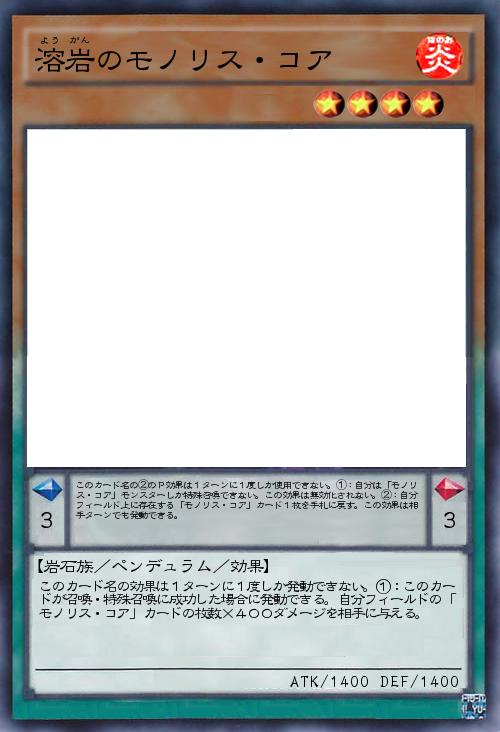| このカード名の効果は1ターンに1度しか発動できない。①:このカードが召喚・特殊召喚に成功した場合に発動できる。自分フィールドの「モノリス・コア」カードの枚数×400ダメージを相手に与える。 | |||
