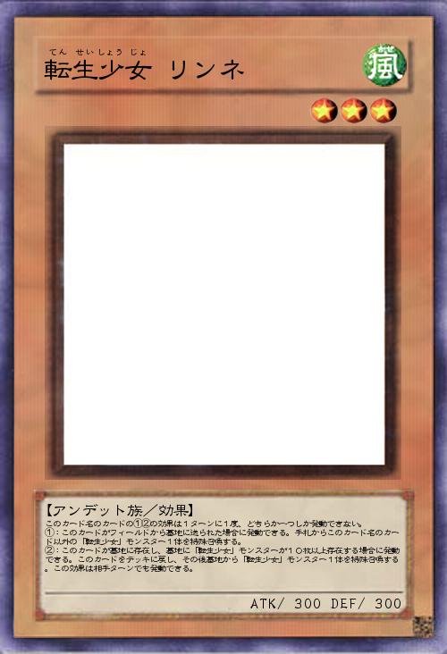 | このカード名のカードの①②の効果は1ターンに1度、どちらか一つしか発動できない。 ①:このカードがフィールドから墓地に送られた場合に発動できる。手札からこのカード名のカード以外の「転生少女」モンスター1体を特殊召喚する。 ②:このカードが墓地に存在し、墓地に「転生少女」モンスターが10枚以上存在する場合に発動できる。このカードをデッキに戻し、その後墓地から「転生少女」モンスター1体を特殊召喚する。この効果は相手ターンでも発動できる。 | |||