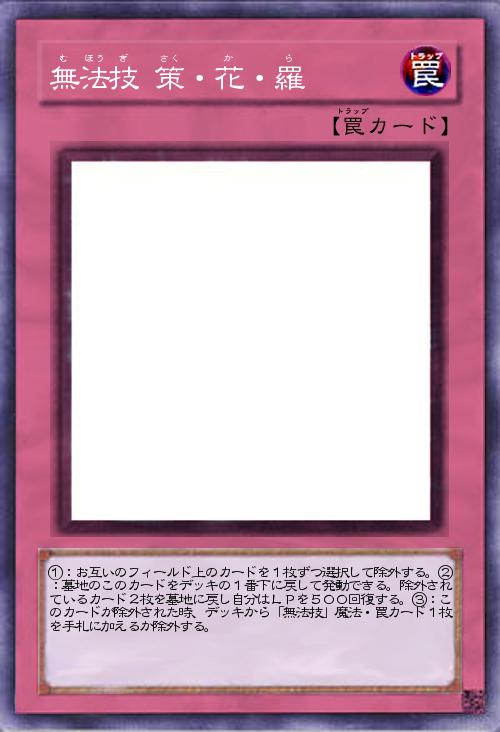 | ①:お互いのフィールド上のカードを1枚ずつ選択して除外する。②:墓地のこのカードをデッキの1番下に戻して発動できる。除外されているカード2枚を墓地に戻し自分はLPを500回復する。③:このカードが除外された時、デッキから「無法技」魔法・罠カード1枚を手札に加えるか除外する。 | |||