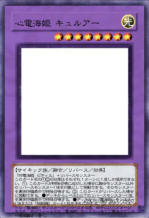 | 「球電海姫 ピティエ」+リバースモンスター このカード名の①②の効果はそれぞれ1ターンに1度しか使用できない。①:このカードが特殊召喚に成功した場合に融合モンスター以外のリバースモンスター1体を対象にして発動できる。そのモンスターを裏側守備表示で特殊召喚する。②:このカードがリバースした場合に発動できる。●デッキからレベル2以下のリバースモンスター1体を裏側守備表示で特殊召喚する。●デッキから「電海姫」モンスター1体または「地銅機」カード1枚を手札に加える。③:自分フィールドの「電海姫」モンスターがリバースする度、相手に200ダメージを与え、自分フィールドの「電海姫」モンスター全てに電海カウンターを1個ずつ置く。 | |||