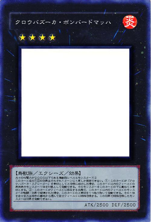 | 元々の攻撃力が2000以下である鳥獣族レベル4モンスター×2 このカード名の①②の効果はそれぞれ1ターンに1度しか使用できない。①:このカードが「クロウバズーカ・スクレーター」を素材としてX召喚に成功した場合、このカード以外のフィールドの表側表示モンスター1体を対象として発動できる。そのモンスターをこのカードの下に重ねてX素材とする。②:このカードがフィールドに存在する状態で、このカード以外のフィールドのモンスターが戦闘・効果で破壊された場合、このカードのX素材を1つ取り除いて発動できる。その1体を自分または相手の墓地から選んで自分フィールドに特殊召喚する。この効果で特殊召喚したモンスターは効果を発動できない。 | |||