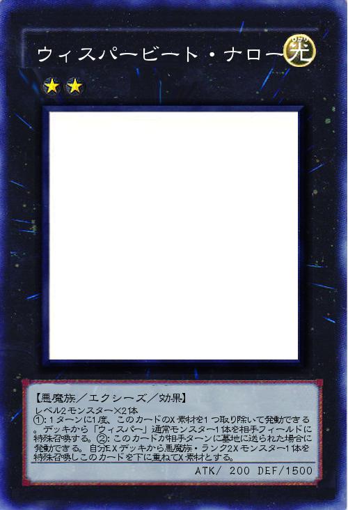 | レベル2モンスター×2体 ①:1ターンに1度、このカードのX素材を1つ取り除いて発動できる。デッキから「ウィスパー」通常モンスター1体を相手フィールドに特殊召喚する。②:このカードが相手ターンに墓地に送られた場合に発動できる。自分EXデッキから悪魔族・ランク2Xモンスター1体を特殊召喚しこのカードを下に重ねてX素材とする。 | |||