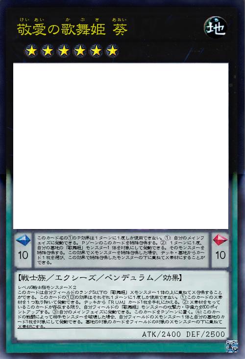 | レベル6戦士族モンスター×2 このカードは自分フィールドのランク5以下の「歌舞姫」Xモンスター1体の上に重ねてX召喚することができる。このカードの①③の効果はそれぞれ1ターンに1度しか使用できない。①:このカードのX素材を1つ取り除いて発動できる。デッキから「RUM」カード1枚を手札に加える。②:X素材をもっているこのカードが存在する限り、自分フィールドの「歌舞姫」モンスターの攻撃力・守備力を800ポイントアップする。③:自分のメインフェイズに発動できる。このカードをPゾーンに置く。④:このカードの戦闘によって相手モンスターを破壊した場合、自分フィールドのXモンスター1体と自分の墓地のカード1枚を対象にして発動できる。墓地の対象のカードをフィールドの対象のXモンスターの下に重ねてX素材にする。 | |||