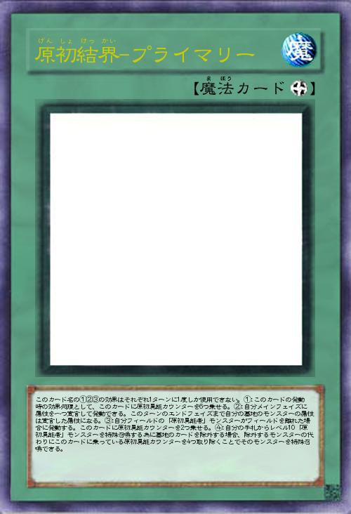 | このカード名の①②③の効果はそれぞれ1ターンに1度しか使用できない。①:このカードの発動時の効果処理として、このカードに原初異能カウンターを6つ乗せる。②:自分メインフェイズに属性を一つ宣言して発動できる。このターンのエンドフェイズまで自分の墓地のモンスターの属性は宣言した属性になる。③:自分フィールドの「原初異能者」モンスターがフィールドを離れた場合に発動する。このカードに原初異能カウンターを2つ乗せる。④:自分の手札からレベル10「原初異能者」モンスターを特殊召喚する為に墓地のカードを除外する場合、除外するモンスターの代わりにこのカードに乗っている原初異能カウンターを4つ取り除くことでそのモンスターを特殊召喚できる。 | |||