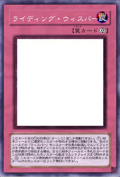 | このカード名の①の効果は1ターンに1度しか発動できない。①:相手フィールドに通常モンスターが存在する場合に発動できる。自分フィールドの「ウィスパー」モンスターを任意の数選んでエンドフェイズまで除外する。相手フィールドに元々の持ち主が自分となるカードが表側表示で存在する場合、さらに相手フィールド・手札のカードをこの効果で除外したモンスターの数までエンドフェイズまで除外する。②:このカードが表側表示で存在する限りフィールドの効果モンスター以外のモンスターはリンク素材にできない。 | |||