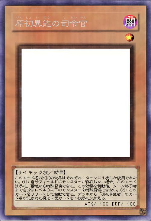 | このカード名の①②の効果はそれぞれ1ターンに1度しか使用できない。①:自分フィールドにモンスターが存在しない場合、このカードは手札、墓地から特殊召喚できる。この効果を発動後、ターン終了時まで自分はレベル3以下のモンスターを特殊召喚できない。②:このカードをリリースして発動できる。デッキから「原初異能者」のカード名が記された魔法・罠カードを1枚手札に加える。 | |||