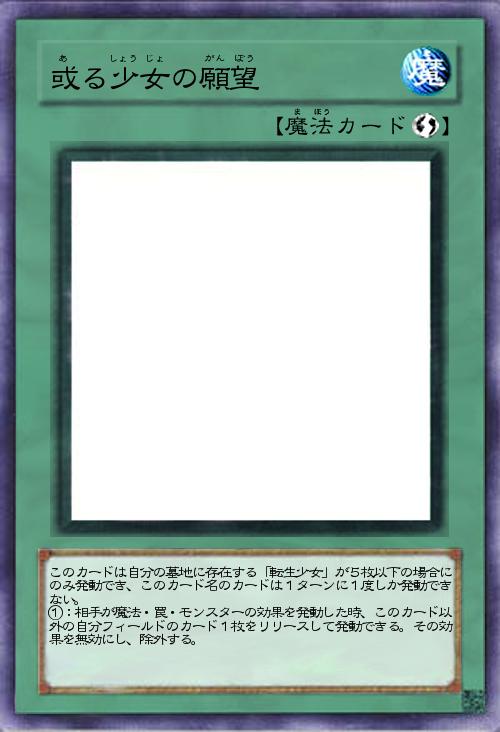 | このカードは自分の墓地に存在する「転生少女」が5枚以下の場合にのみ発動でき、このカード名のカードは1ターンに1度しか発動できない。 ①:相手が魔法・罠・モンスターの効果を発動した時、このカード以外の自分フィールドのカード1枚をリリースして発動できる。その効果を無効にし、除外する。 | |||