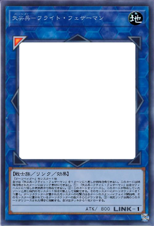 | 「ダーツベイダー」モンスター1体 自分は「矢尖兵-フライト・フェザーマン」を1ターンに1度しか特殊召喚できない。このカードは特殊召喚されたターンにはリンク素材にできない。①:「矢尖兵-フライト・フェザーマン」は自分フィールドに1体しか表側表示で存在できない。②:このカードをリリースし、このカードが存在していたゾーンと同じ縦列のモンスター1体を対象として発動できる。そのモンスターにダーツカウンターを1つ置く。ダーツカウンターが置かれたモンスターの攻撃力は各ターンのスタンバイフェイズ開始時、そのモンスターに置かれているダーツカウンターの数×500ダウンする。③:相互リンク状態のこのカードがリリースされた場合に発動する。自分はデッキから1枚ドローする。 | |||
