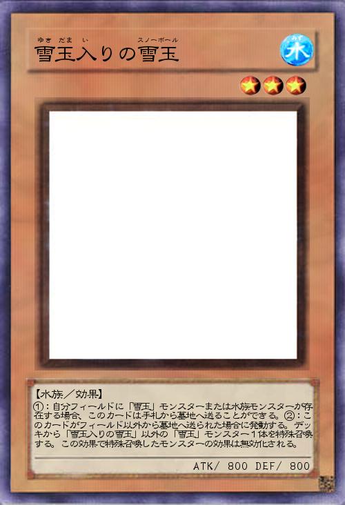 | ①:自分フィールドに「雪玉」モンスターまたは水族モンスターが存在する場合、このカードは手札から墓地へ送ることができる。②:このカードがフィールド以外から墓地へ送られた場合に発動する。デッキから「雪玉入りの雪玉」以外の「雪玉」モンスター1体を特殊召喚する。この効果で特殊召喚したモンスターの効果は無効化される。 | |||