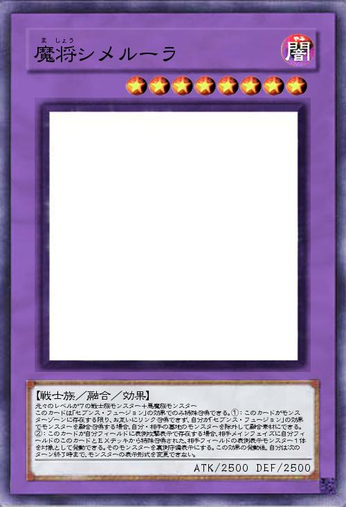 | 元々のレベルが7の戦士族モンスター+悪魔族モンスター このカードは「セブンス・フュージョン」の効果でのみ特殊召喚できる。①:このカードがモンスターゾーンに存在する限り、お互いにリンク召喚できず、自分が「セブンス・フュージョン」の効果でモンスターを融合召喚する場合、自分・相手の墓地のモンスターを除外して融合素材にできる。②:このカードが自分フィールドに表側攻撃表示で存在する場合、相手メインフェイズに自分フィールドのこのカードとEXデッキから特殊召喚された、相手フィールドの表側表示モンスター1体を対象として発動できる。そのモンスターを裏側守備表示にする。この効果の発動後、自分は次のターン終了時まで、モンスターの表示形式を変更できない。 | |||
