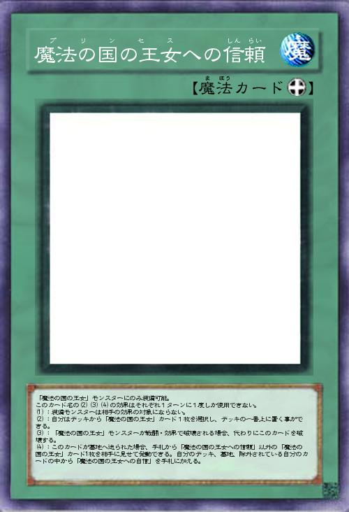 | 「魔法の国の王女」モンスターにのみ装備可能。 このカード名の(2)(3)(4)の効果はそれぞれ1ターンに1度しか使用できない。 (1):装備モンスターは相手の効果の対象にならない。 (2):自分はデッキから「魔法の国の王女」カード1枚を選択し、デッキの一番上に置く事ができる。 (3):「魔法の国の王女」モンスターが戦闘・効果で破壊される場合、代わりにこのカードを破壊する。 (4):このカードが墓地へ送られた場合、手札から「魔法の国の王女への信頼」以外の「魔法の国の王女」カード1枚を相手に見せて発動できる。自分のデッキ、墓地、除外されている自分のカードの中から「魔法の国の王女への自信」を手札に加える。 | |||